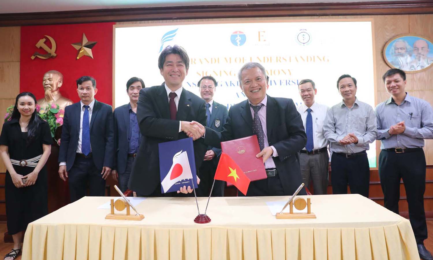 Giám đốc Bệnh viện E, Chủ nhiệm Khoa Y Dược, ĐHQGHN Lê Ngọc Thành cùng CEO – Chủ tịch Đại học Junshin Gakuen (Nhật Bản) Younosuke Fukuda ký kết Biên bản ghi nhớ hợp tác giữa hai bên.