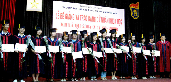 QH - 2004_X qua những con số: - Số sinh viên nhập học: 1250 - Số sinh viên tốt nghiệp: 1177 (94,2%) - Số sinh viên chưa tốt nghiệp: 73 (5,8%) - Sinh viên tốt nghiệp loại giỏi và xuất sắc: 186 (chiếm 15,82%, tăng 0,52% so với K48) - Sinh viên tốt nghiệp loại khá: 785 (chiếm 66,7%, tăng 4,7% so với K48) - Sinh viên tốt nghiệp loại trung bình khá: 206 (chiếm 17,48%, giảm 5% so với K48) - Sinh viên tốt nghiệp loại trung bình: 0% - Số sinh viên tốt nghiệp hệ chất lượng cao: 97, trong đó có 92% đạt loại xuất sắc (tăng 4% so với K48), 8% sinh viên tốt nghiệp loại khá (giảm 4% so với K48). - Những ngành có tỷ lệ tốt nghiệp loại giỏi cao: Văn học (29%), Triết học (25%), Đông phương học (25%). - Ngành học có 100% sinh viên tốt nghiệp: Thông tin - Thư viện - Về hoạt động NCKHSV của K49: 71/238 công trình NCKHSV đạt giải cấp trường; 11/23 công trình đạt giải thưởng cấp Bộ. - Số sinh viên K49 được kết nạp vào Đảng CSVN: 41 - Sinh viên được Nhà trường khen thưởng vì có kết quả học tập cao nhất trong khoá: 16