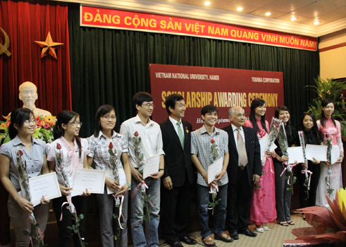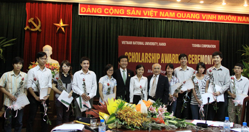 PGS.TS Phạm Trọng Quát – Phó Giám đốc ĐHQGHN cùng TS. Katsuhiko Yamasshita – chuyên gia cao cấp của Quỹ học bổng Toshiba đã trao giấy chứng nhận cho các học viên. Trong số này có 11 học viên được nhận học bổng toàn phần, trị giá tương đương 100.000 JPY/học viên/năm học và 9 học viên được nhận học bổng bán phần, trị giá tương đương 50.000 JPY/học viên/năm học