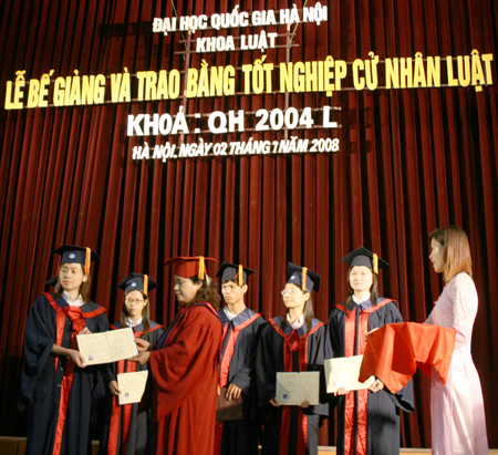 Cũng trong khóa học này, Khoa Luật đã đào tạo được một lớp cử nhân ngành Luật Kinh doanh gồm 54 sinh viên. Đây là năm thứ hai Khoa Luật cấp bằng cho sinh viên thuộc mã ngành này. Trong số đó có 3 sinh viên đạt loại giỏi, chiếm tỉ lệ 5,56%, 36 sinh viên đạt loại khá (66,7%) và 4 sinh viên đạt loại trung bình khá (27,8%). Trong khuôn khổ hợp tác đào tạo đại học với các trường đại học của Pháp và cộng đồng Pháp ngữ (AUF), Khoa Luật đã tổ chức một lớp Pháp chuyên, gồm 20 sinh viên, trong đó có 5 sinh viên đã được nhận học bổng du học Pháp và 15 sinh viên được cấp chứng chỉ của tổ chức AUF. Trong đợt bảo vệ khóa luận của khóa QH-2004-L có 4 sinh viên lớp này tham gia bảo vệ khóa luận bằng tiếng Pháp và được hội đồng đánh giá cao.