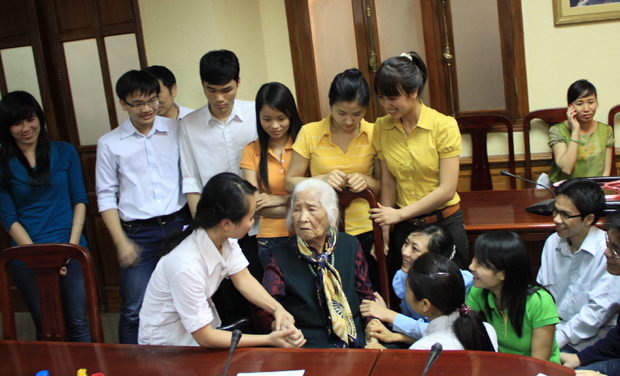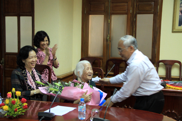 PGS.TS Phạm Trọng Quát – Phó Giám đốc ĐHQGHN tặng hoa cụ Phan Thị Khóa |
