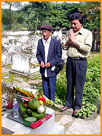 Anh Phạm Thành Long, Giám đốc Quỹ học bổng Vừ A Dính và cụ Vừ Gà Lử, 90 tuổi, anh trai của Anh hùng Liệt sĩ Vừ A Dính thắp hương trước ngôi mộ anh hùng Liệt sĩ Vừ A Dính. (Nguồn ảnh: www.tntp.org.vn) |