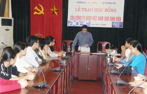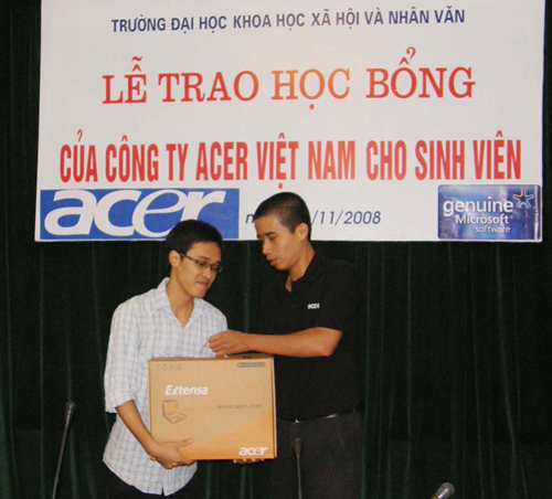 Sinh viên Nguyễn Ngọc Quân - khóa QH-2005-X ngành Văn học được nhận một máy tính xách tay hiệu Acer trị giá 10.500.000 đồng. Đây là sinh viên năm thứ tư có thành tích vượt khó học tập tốt với số điểm trung bình năm học vừa qua đạt 8,8.