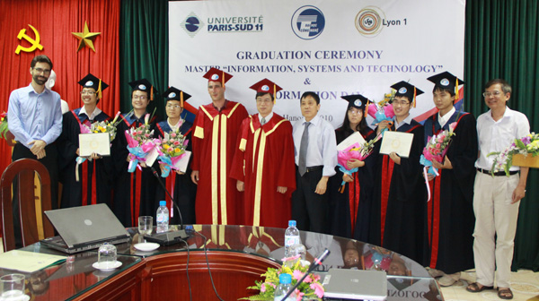 Phát biểu tại lễ trao bằng, GS.TS Mai Trọng Nhuận – Giám đốc ĐHQGHN chúc mừng 6 tân thạc sĩ đã vượt qua những khó khăn về ngôn ngữ, chuyên môn và các vấn đề khác để hoàn thành khóa học. GS cho rằng quá trình đào tạo những thạc sĩ IST là sự kết hợp “3 trong 1” của rất nhiều yếu tố như: chuyên ngành Thông tin – Hệ thống và Công nghệ đào tạo bằng cả 3 ngôn ngữ Anh – Việt – Pháp. Các tân thạc sĩ là các nhà khoa học, cựu sinh viên của 2 ĐH và là cầu nối hợp tác giữa 2 quốc gia, 2 cơ sở giáo dục uy tín. Các tân thạc sĩ IST là sản phẩm của sự hợp tác – chuyên gia và nghiên cứu khoa học chất lượng theo chuẩn Pháp. Đây đồng thời là biểu hiện thành công của mô hình hợp tác giữa 2 Chính phủ, 2 ĐH và 2 đơn vị đào tạo. Chương trình đào tạo ThS. IST là kết quả của sự liên kết, liên thông và sự điều phối giữa ĐH Paris Sud 11, PUF Hanoi và Trường ĐH Công nghệ, là biểu hiện sinh động thương hiệu, uy tín của ĐHQGHN, ĐH Paris Sud 11 của thầy cô giáo và của chính bản thân anh chị em học viên.