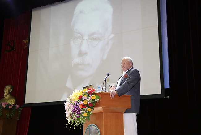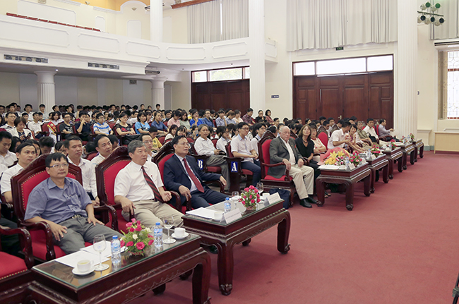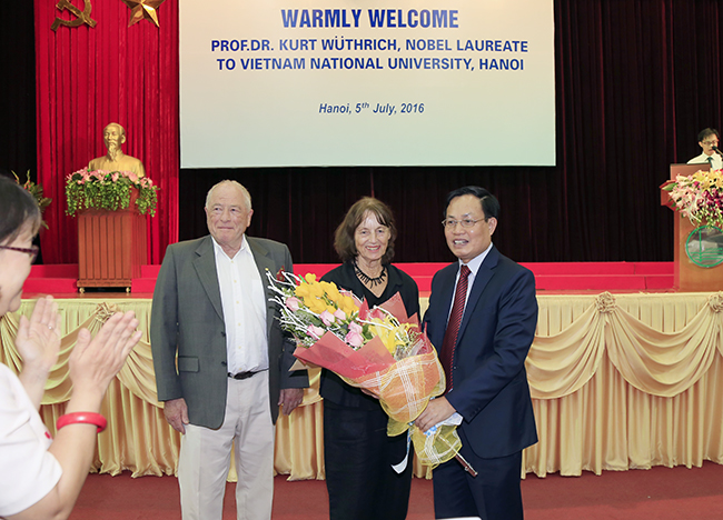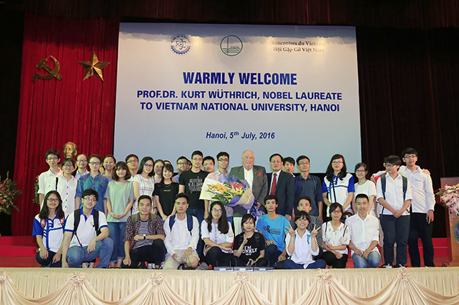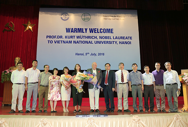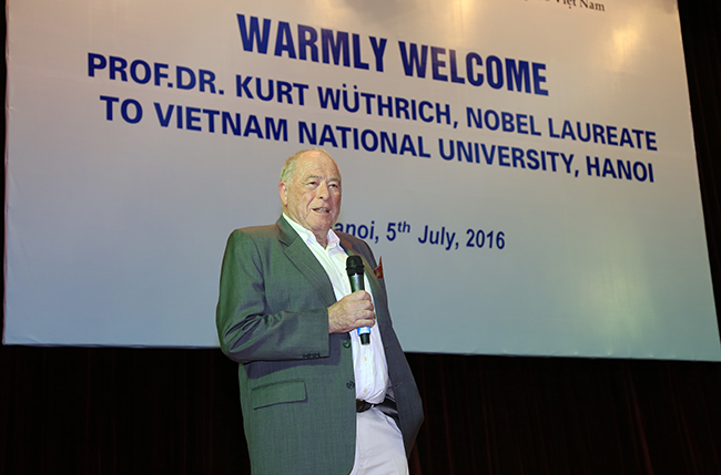 Tại buổi diễn thuyết, GS. Kurt Wüthrich đã thuyết trình trước giảng viên, học sinh, sinh viên ĐHQGHN và một số trường đại học tại Hà Nội với nội dung “Cuộc đời khoa học của tôi - từ Vật lý cộng hưởng từ hạt nhân đến protein và chẩn đoán y học”