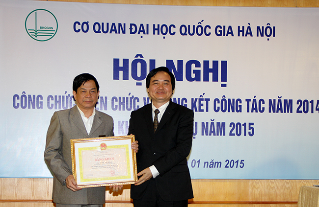 Giám đốc Phùng Xuân Nhạ trao Bằng khen của GĐ ĐHQGHN cho ông Lê Quang Mạnh, cán bộ Đội xe - Văn phòng ĐHQGHN vì đã có nhiều đóng góp cho sự nghiệp xây dựng và phát triển Cơ quan và ĐHQGHN.