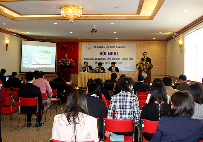 Chánh Văn phòng ĐHQGHN Nguyễn Viết Lộc trình bày dự thảo Báo cáo tổng kết năm 2014 và nhiệm vụ trọng tâm năm 2015