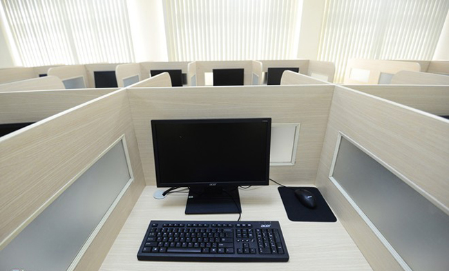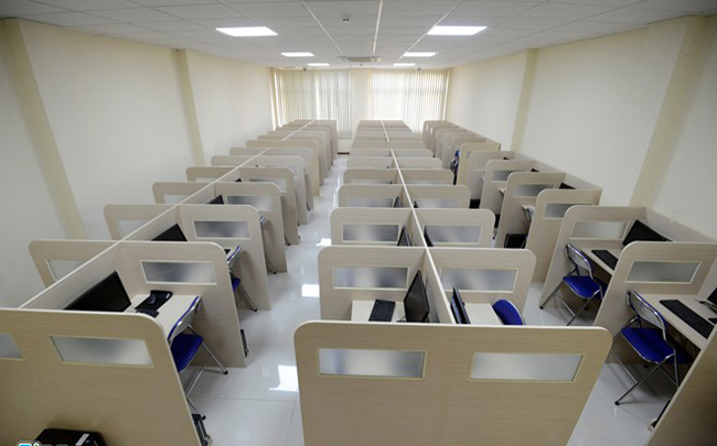 Phòng thi chuẩn bị cho kỳ thi đánh giá năng lực được trang bị 100% máy tính hiện đại, chỗ ngồi được ngăn cách bằng lớp gỗ.