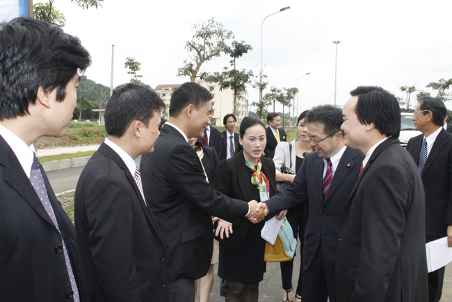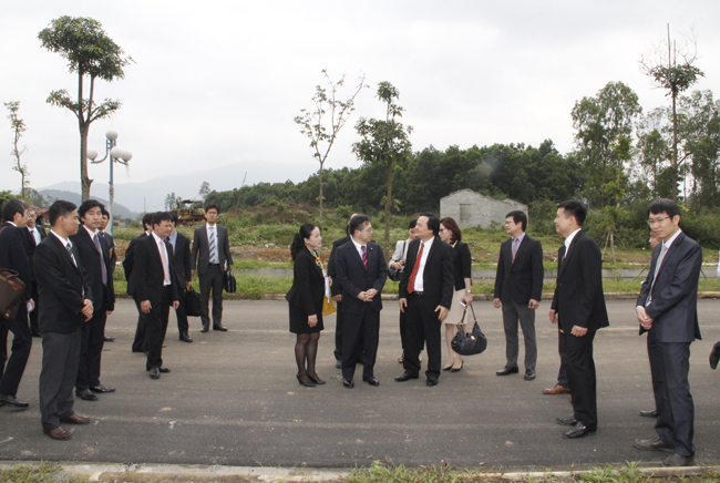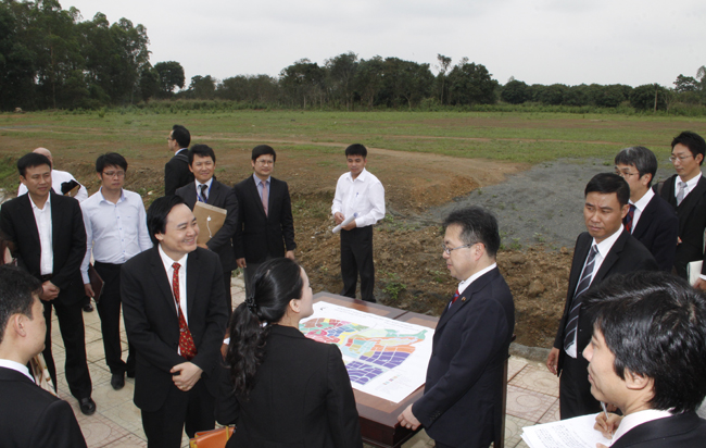 Giám đốc ĐHQGHN Phùng Xuân Nhạ cùng lãnh đạo, cán bộ Ban Quản lý trường Đại học Việt - Nhật tiếp đón ông Seko Hiroshige tại khu đất xây dựng trường ĐH Việt - Nhật