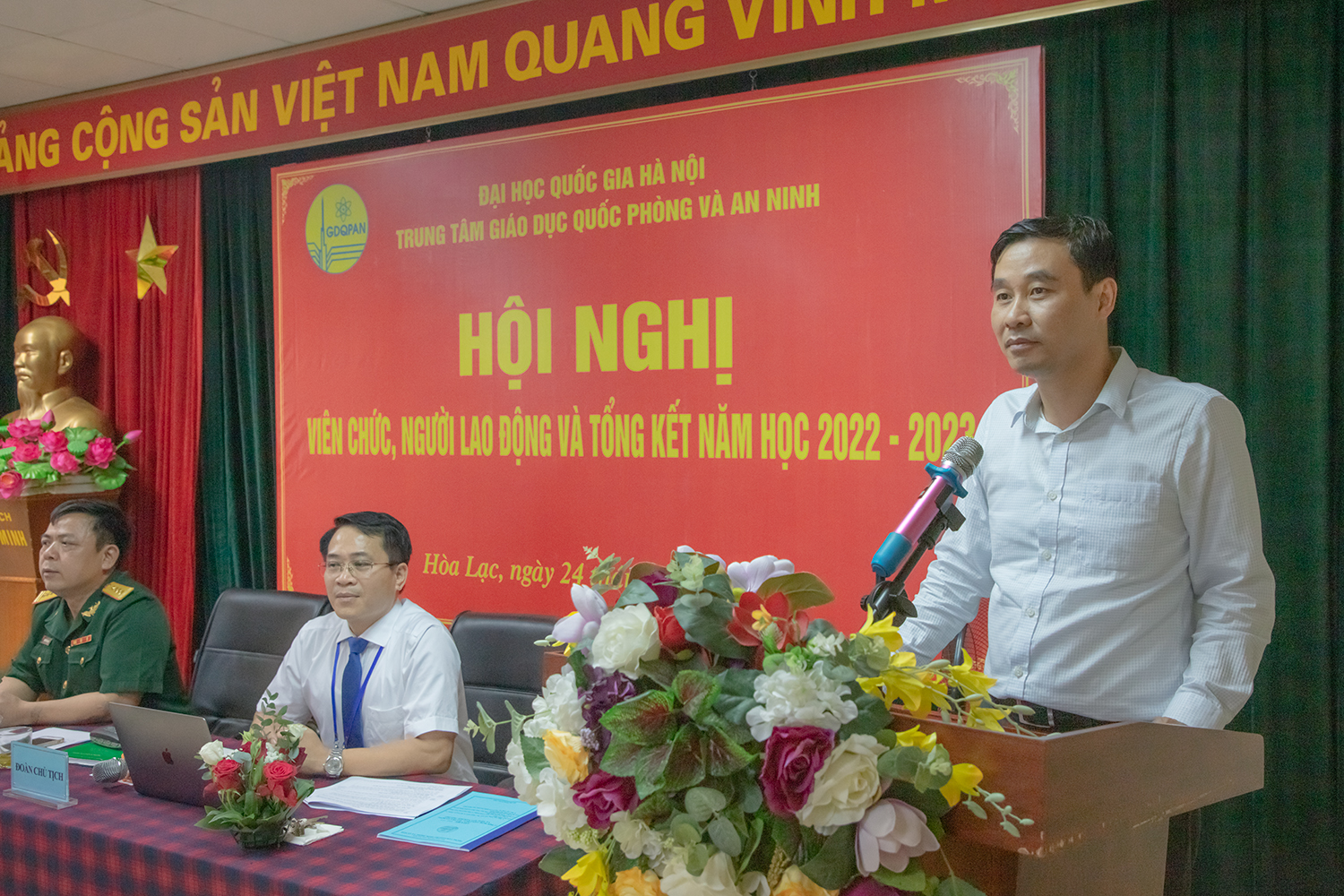 Phát biểu tại hội nghị, Phó Giám đốc ĐHQGHN Nguyễn Hoàng Hải đánh giá cao Trung tâm trong GDQP&AN tổ chức, quản lý và thực hiện tốt các nhiệm vụ được giao theo đúng quy định của pháp luật và chức trách được phân công và tiếp tục xây dựng Trung tâm trở thành địa chỉ tin cậy, có uy tín, vị thế hàng đầu trong hệ thống trung tâm GDQP&AN cả nước. Đặc biệt, trong năm học vừa qua, Trung tâm GDQP&AN đã thích ứng nhanh chóng với sự phát triển của ĐHQGHN, là đơn vị tiên phong hỗ trợ, triển khai các hoạt động giảng dạy tại Hòa Lạc; đảm bảo tốt các điều kiện phục vụ, dịch vụ tạo điều kiện tốt nhất cho người học học tập và rèn luyện tại đây.