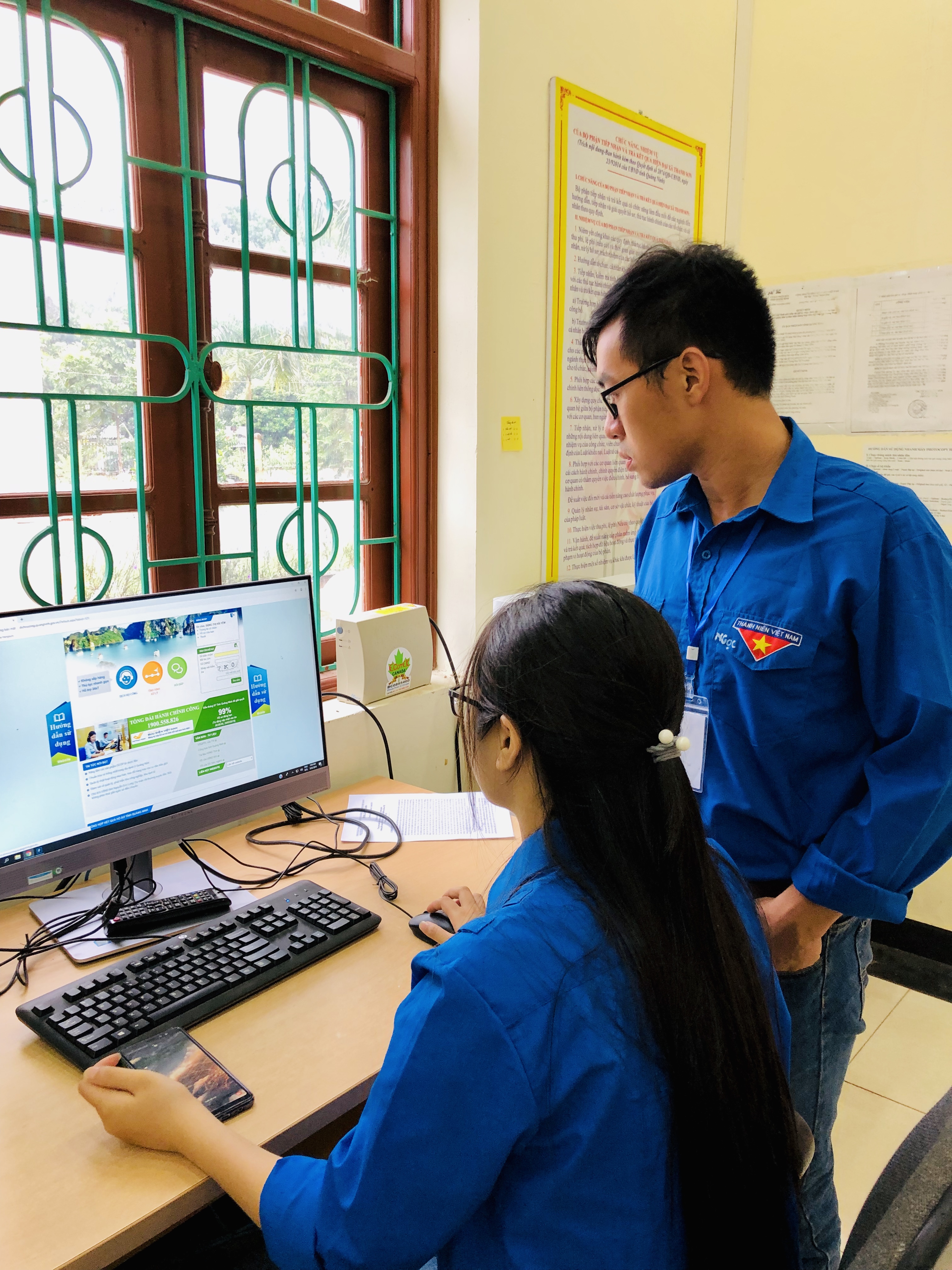 Các tình nguyện viên hỗ trợ UBND các xã công tác hành chính công, phổ cập kiến thức hành chính điện tử tới nhân dân địa phương