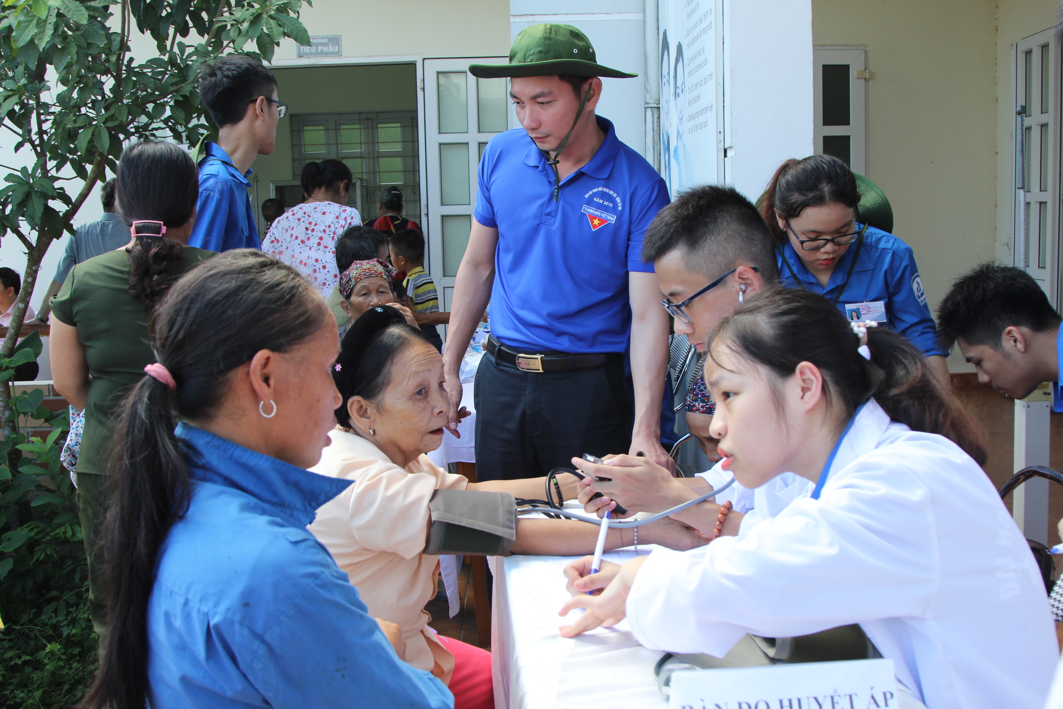 Đội hình tình nguyện của Khoa Y Dược phối hợp với các bác sĩ của Bệnh viện ĐHQGHN, Bệnh viện E và TW Hội chữ thập đỏ Việt Nam tổ chức khám và phát thuốc miễn phí