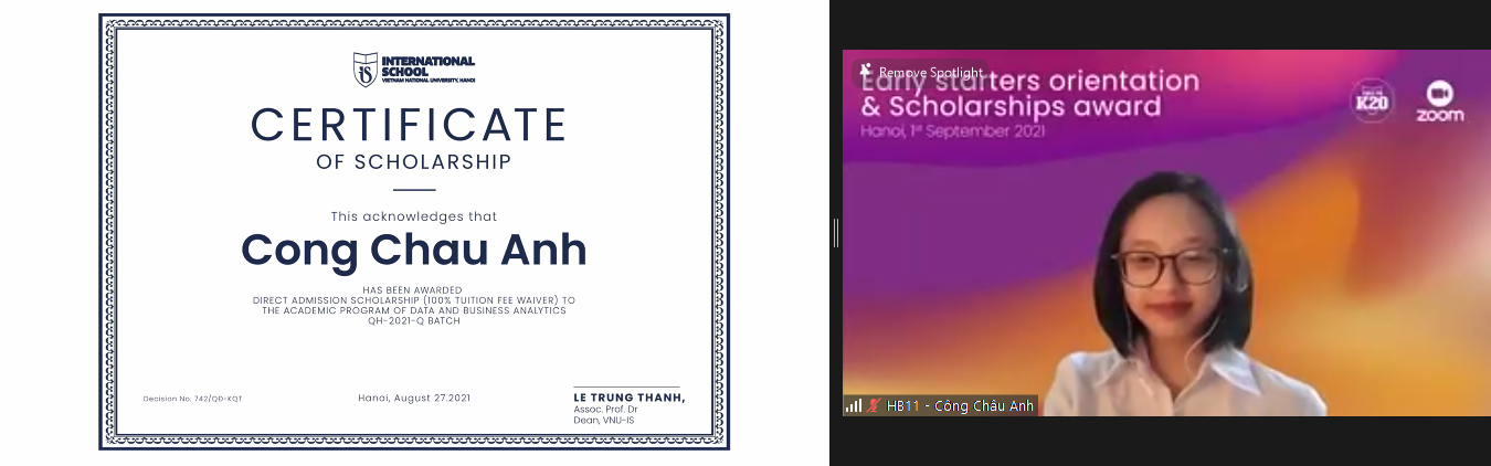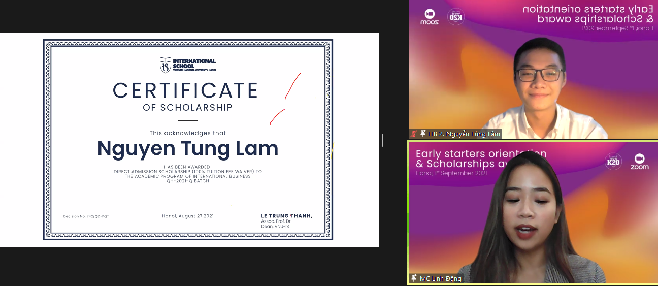 Cũng trong chương trình, Khoa Quốc tế đã trao giấy chứng nhận cho các tân sinh viên giấy chứng nhận học bổng toàn phần và bán phần cho 23 tân sinh viên đạt giải cao trong các cuộc thi quốc gia và quốc tế hoặc điểm thi IELTS từ 6.5 trở lên. Để nhận được học bổng tuyển thẳng của Khoa, các tân sinh viên đã trải qua vòng xét duyệt hồ sơ và phỏng vấn để thể hiện những năng lực nổi bật của cá nhân và tiềm năng đóng góp, lan tỏa giá trị tích cực cho cộng đồng, góp phần phát triển Khoa Quốc tế.