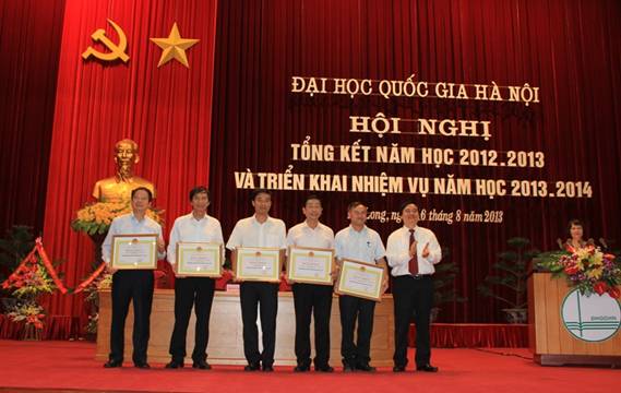 Giám đốc ĐHQG Hà Nội Phùng Xuân Nhạ trao bằng khen cho các tập thể,