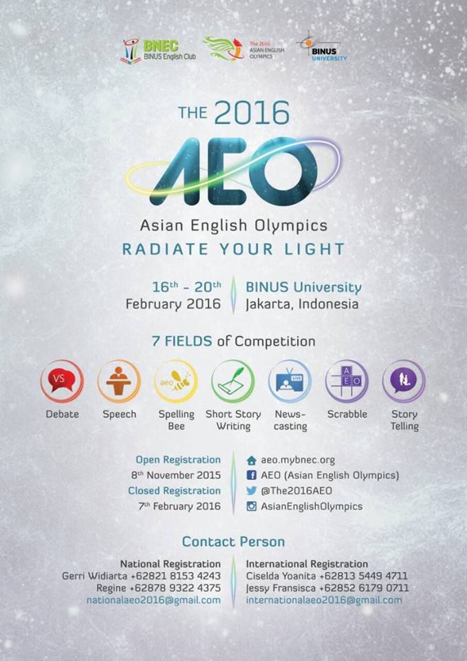 Trường Đại học BINUS, Indonesia đã gửi thông báo và thư mời sinh viên Đại học Quốc gia Hà Nội tham dự Cuộc thi Olympic tiếng Anh châu Á 2016 (AEO). Cuộc thi này được tổ chức từ năm 2004 với sự tham gia của sinh viên từ rất nhiều quốc gia Châu Á như: Indonesia, Singapore, Malaysia, Philippines, Hồng Kông, Macao, Thái Lan. Đây là cơ hội tốt để các bạn sinh viên khu vực Châu Á đánh giá năng lực tiếng anh của bản thân, đồng thời giao lưu, học hỏi, mở rộng kiến thức thông qua các hoạt động trong chương trình.