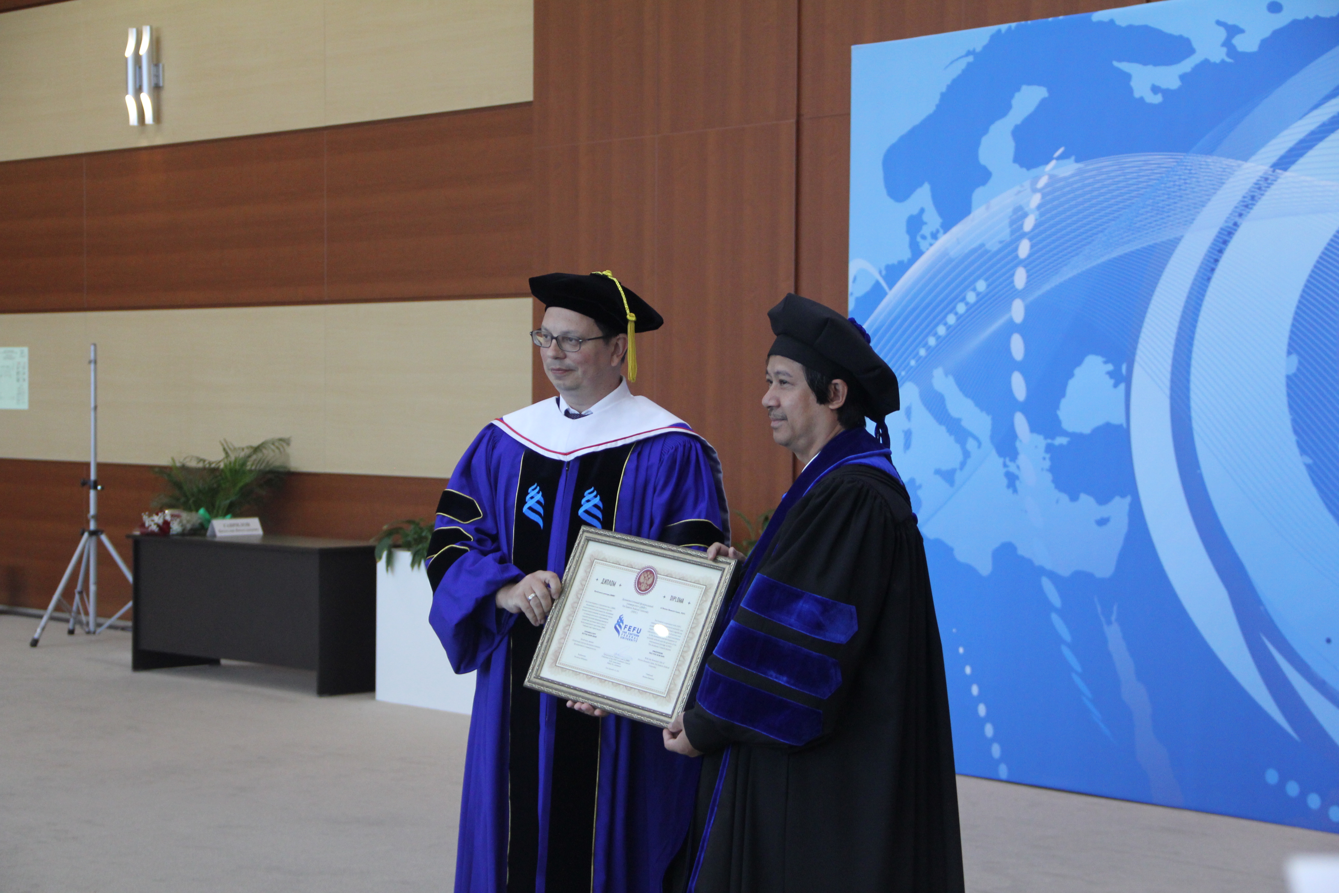Giám đốc ĐH Tổng hợp Liên bang Viễn Đông (FEFU) Nikita Yu. Anisimov trao bằng Tiến sĩ danh dự cho Giám đốc ĐHQGHN Nguyễn Kim Sơn