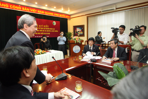 Tham dự và chứng kiến lễ ký kết có ông Phạm Khôi Nguyên – Ủy viên TW Đảng, Bộ trưởng cùng đại diện lãnh đạo một số vụ, cơ quan thuộc Bộ Tài nguyên & Môi trường; về phía ĐHQGHN có GS.TS Mai Trọng Nhuận – Giám đốc, các Phó Giám đốc cùng đại diện lãnh đạo văn phòng và một số ban chức năng, đơn vị trực thuộc..jpg)
