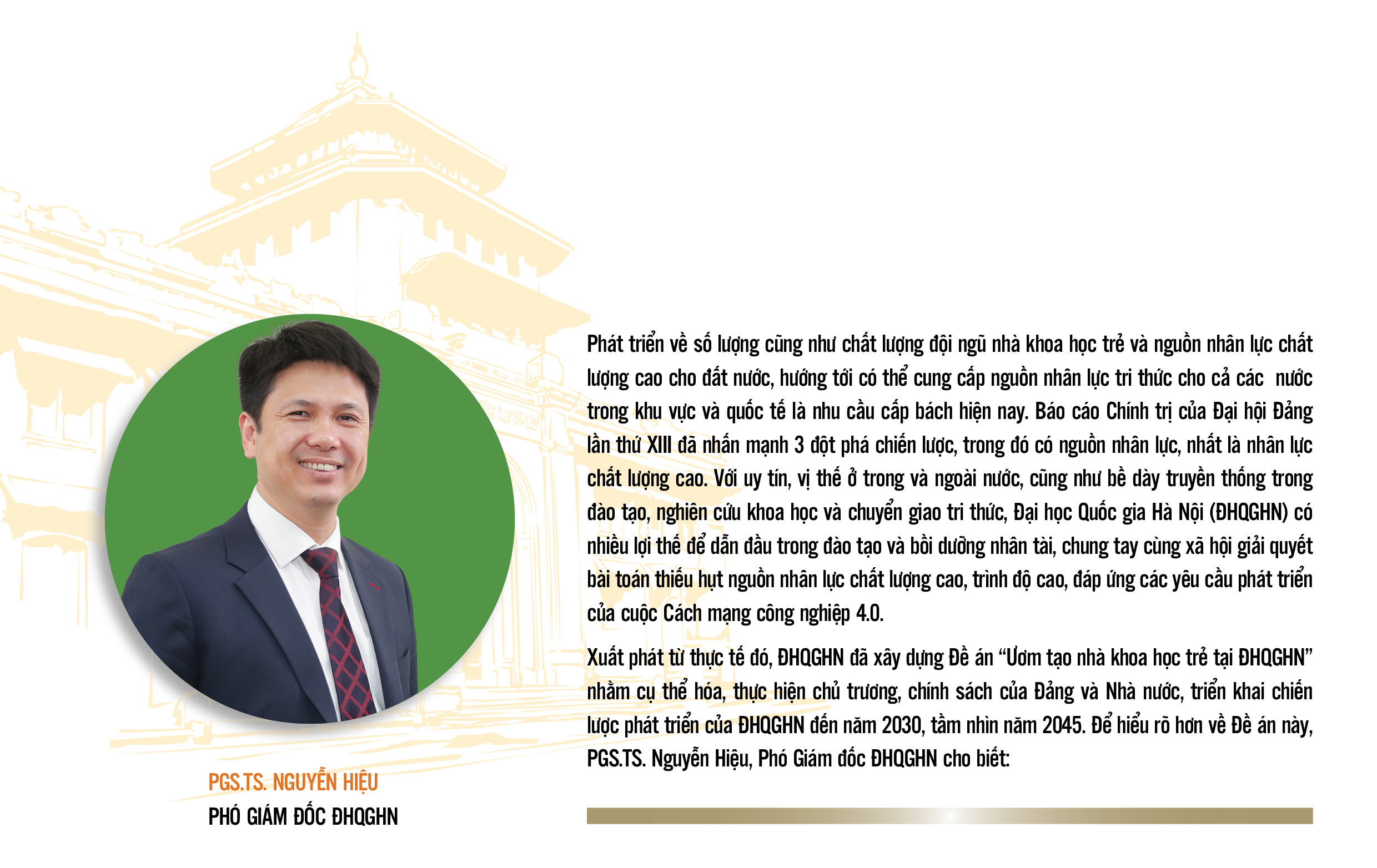 Xuất phát từ thực tế đó, ĐHQGHN đã xây dựng Đề án“Ươm tạo nhà khoa học trẻ tại ĐHQGHN”nhằm cụ thể hóa, thực hiện chủ trương, chính sách của Đảng và Nhà nước, triển khai chiến lược phát triển của ĐHQGHN đến năm 2030, tầm nhìn năm 2045.Để hiểu rõ hơn về Đề án này, PGS.TS. Nguyễn Hiệu, Phó Giám đốc ĐHQGHN cho biết: