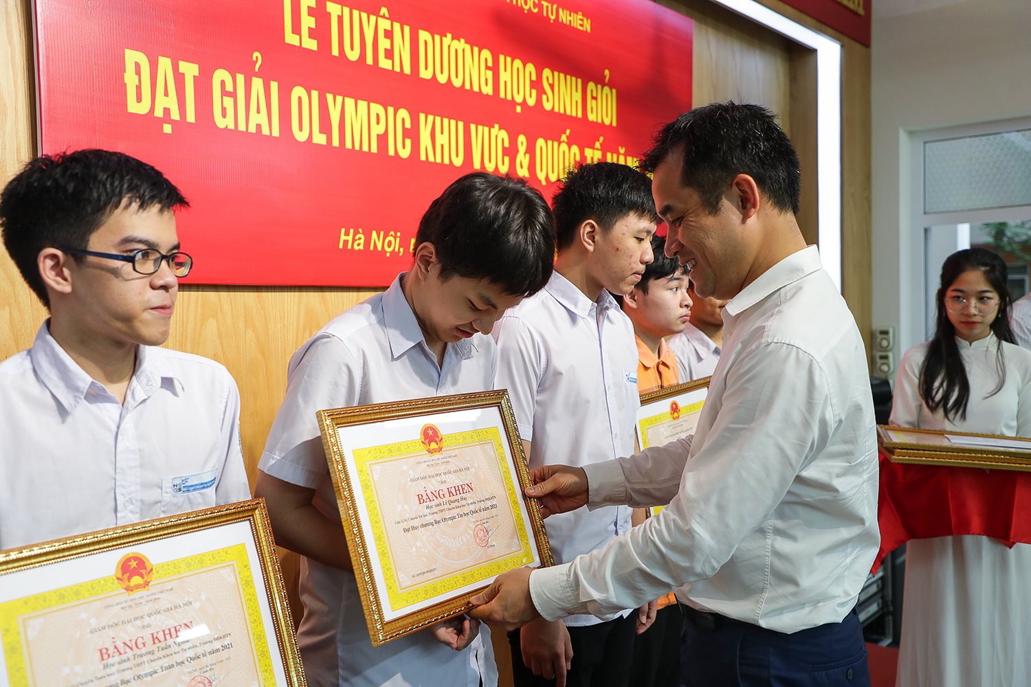 Phó Giám đốc ĐHQGHN Phạm Bảo Sơn tặng Bằng khen của Giám đốc ĐHQGHN cho các học sinh Trường THPT chuyên Khoa học Tự nhiên có thành tích tại các kỳ Olympic khu vực và quốc tế