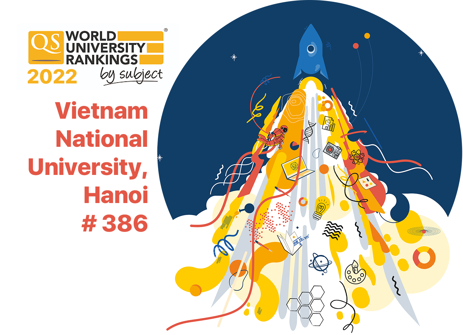 Cũng trong tháng 4/2022, tổ chức giáo dục Quacquarelli Symonds (QS) công bố kết quả bảng xếp hạng 51 lĩnh vực thuộc 5 nhóm lĩnh vực của 1543 cơ sở giáo dục đại học thế giới, với khoảng 14000 chương trình đào tạo.Trong Bảng xếp hạng QS thế giới theo lĩnh vực năm 2022 (QS WUR by subject 2022) này, ĐHQGHN tiếp tục gia tăng vị thế tại các lĩnh vực mũi nhọn. Ngoài 5 lĩnh vực tiếp tục được xếp hạng (trong đó có 4/5 lĩnh vực gia tăng vị trí xếp hạng), ĐHQGHN có thêm 1 lĩnh vực mới được xếp hạng lần đầu tiên là Kỹ thuật điện và điện tử (Engineering – Electrical & Electronic). Trong 6 lĩnh vực được QS xếp hạng trong QS WUR by subject 2022 gồm: Khoa học máy tính và hệ thống thông tin, Cơ kỹ thuật, hàng không và chế tạo, Toán học, Vật lý và thiên văn học, Kinh doanh và Khoa học quản lý và Kỹ thuật điện và điện tử, ĐHQGHN có tới 5/6 lĩnh vực thuộc top 500 thế giới – đặc biệt 3 lĩnh vực Toán học (Mathematics); Vật lý và Thiên văn học (Physics & Astronomy) và Kinh doanh và Khoa học quản lý (Business & Management Studies) đều được xếp hạng số 1 tại Việt Nam.