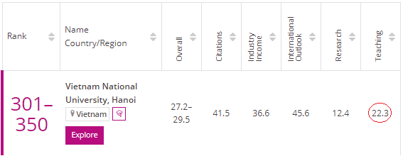 Vị trí và điểm xếp hạng của ĐHQGH trên Bảng xếp hạng Đại học Châu Á 2022 của THE
