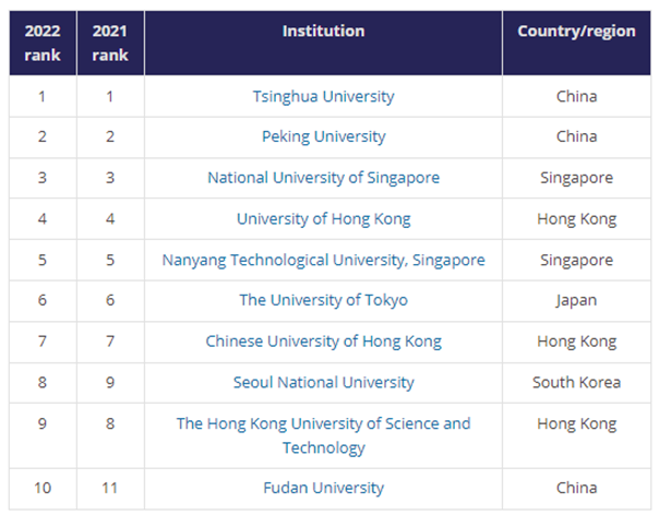 Kết quả xếp hạng năm 2022, top 7 đứng đầu vẫn là là Đại học Thanh Hoa (Tsinghua - Trung Quốc), thứ 2 là Đại học Bắc Kinh (Peking - Trung Quốc), thứ 3 là Đại học Quốc gia Singapore, thứ 4 là Đại học Hồng Kông…như kết quả xếp hạng năm 2021. Hai vị trí thứ 8 và thứ 9 là sự thay đổi chỗ của Đại học Quốc gia Seoul (từ top 9 năm 2021 lên top 8 năm 2022) và Trường Đại học Khoa học và Công nghệ Hồng Kông (từ top 8 năm 2021 xuống top 9 năm 2022). Đại học Phúc Đán - Trung Quốc tăng hạng từ thứ 11 năm 2021 lên top 10 năm 2022.