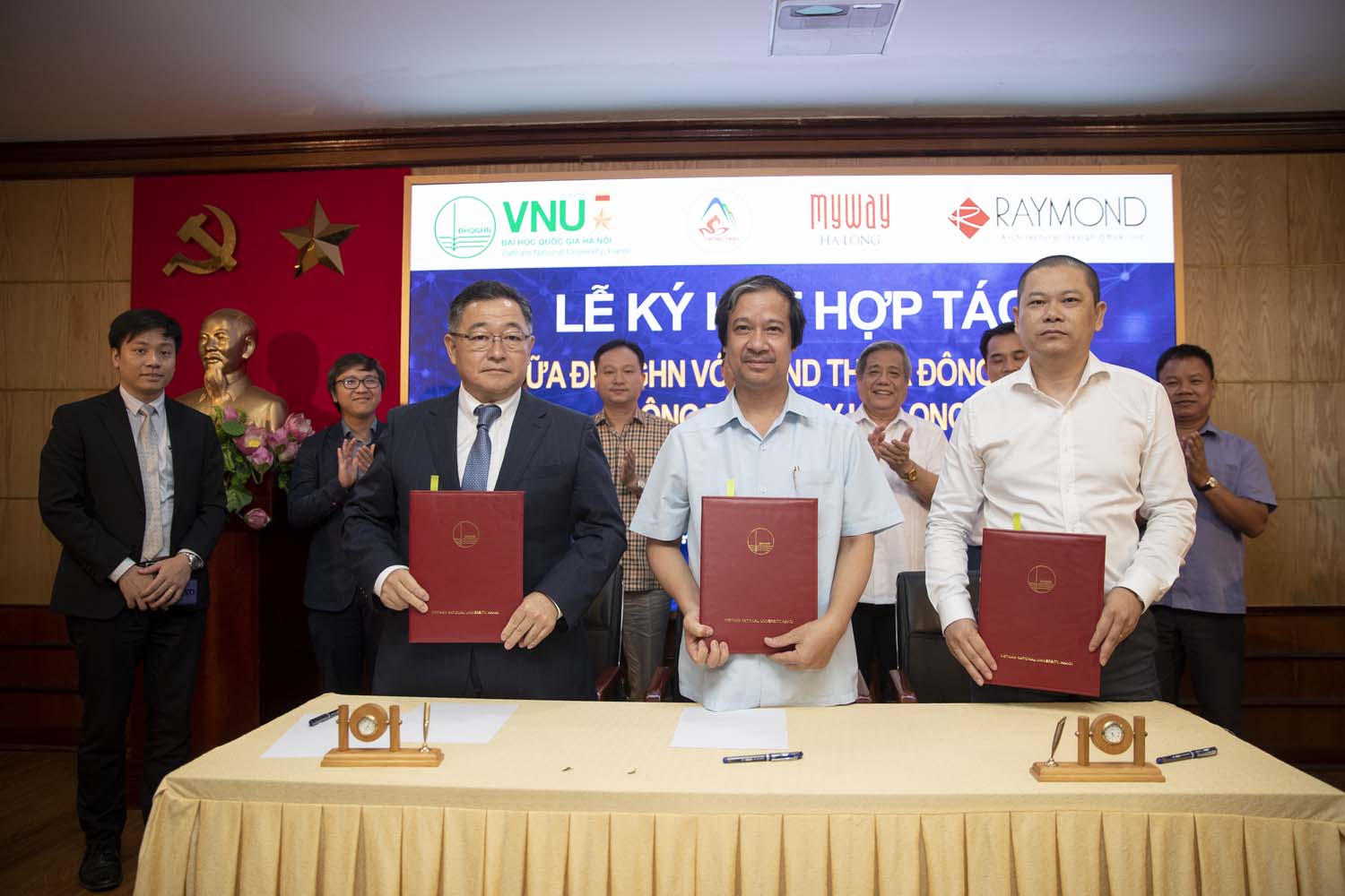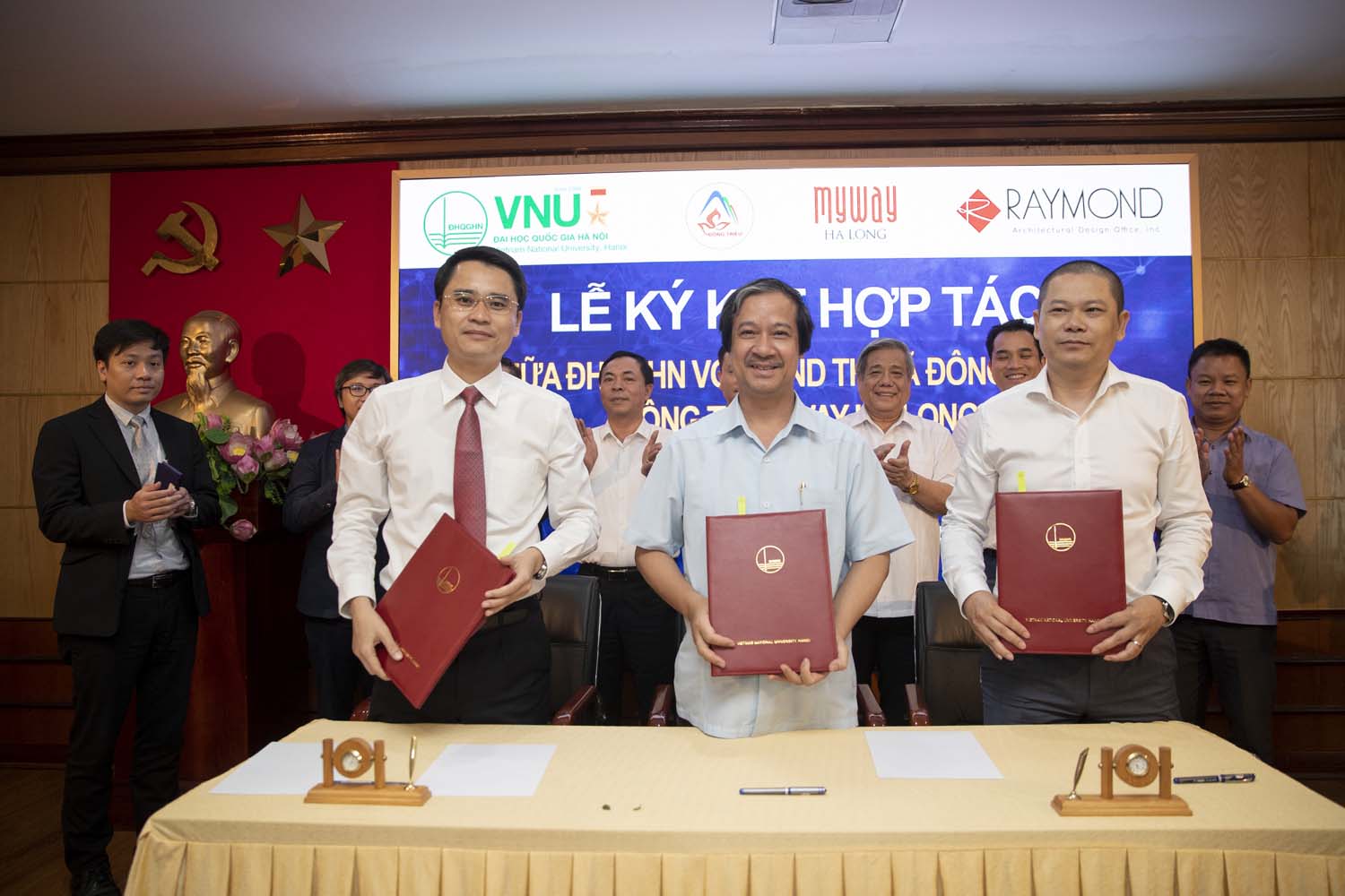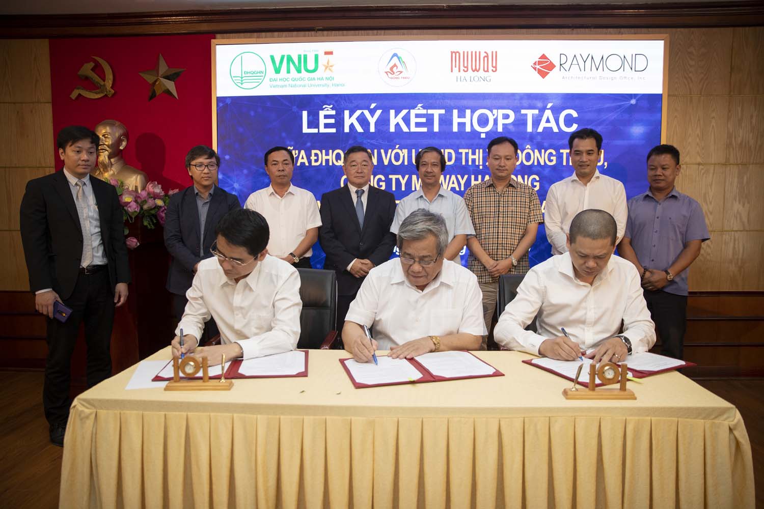 Giám đốc ĐHQGHN Nguyễn Kim Sơn, Ông Honda Tadakatsu, Tổng Giám đốc Công ty TNHH Một Thành viên thiết kế kiến trúc Raymond Việt Nam và Ông Đỗ Vũ Diên, Tổng Giám đốc Công ty Cổ phần Đầu tư và khách sạn MyWay Hạ Long sẽ đại diện cho 3 bên thực hiện phần ký kết