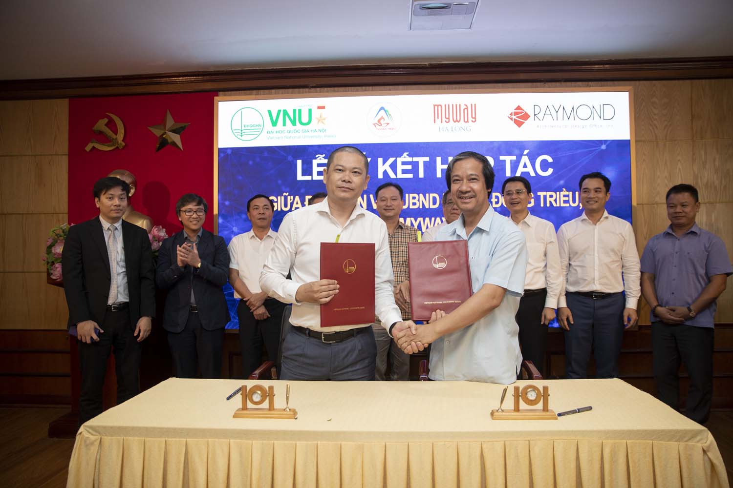 Đại diện pháp nhân của các đơn vị đã kí kết Văn bản ghi nhớ về việc hợp tác 3 bên giữa ĐHQGHN, UBND thị xã Đông Triều và Công ty Cổ phần Đầu tư và Khách sạn MyWay Hạ Long về triển khai dự án đầu tư xây dựng phân viện Viện Trần Nhân Tông trực thuộc ĐHQGHN tại thị xã Đông Triều phục vụ việc đào tạo, nghiên cứu khoa học chuyên sâu trong lĩnh vực Tôn giáo, Phật học đồng thời bảo tồn, phát huy các giá trị văn hoá, lịch sử, triết học của Phật giáo Trúc Lâm.