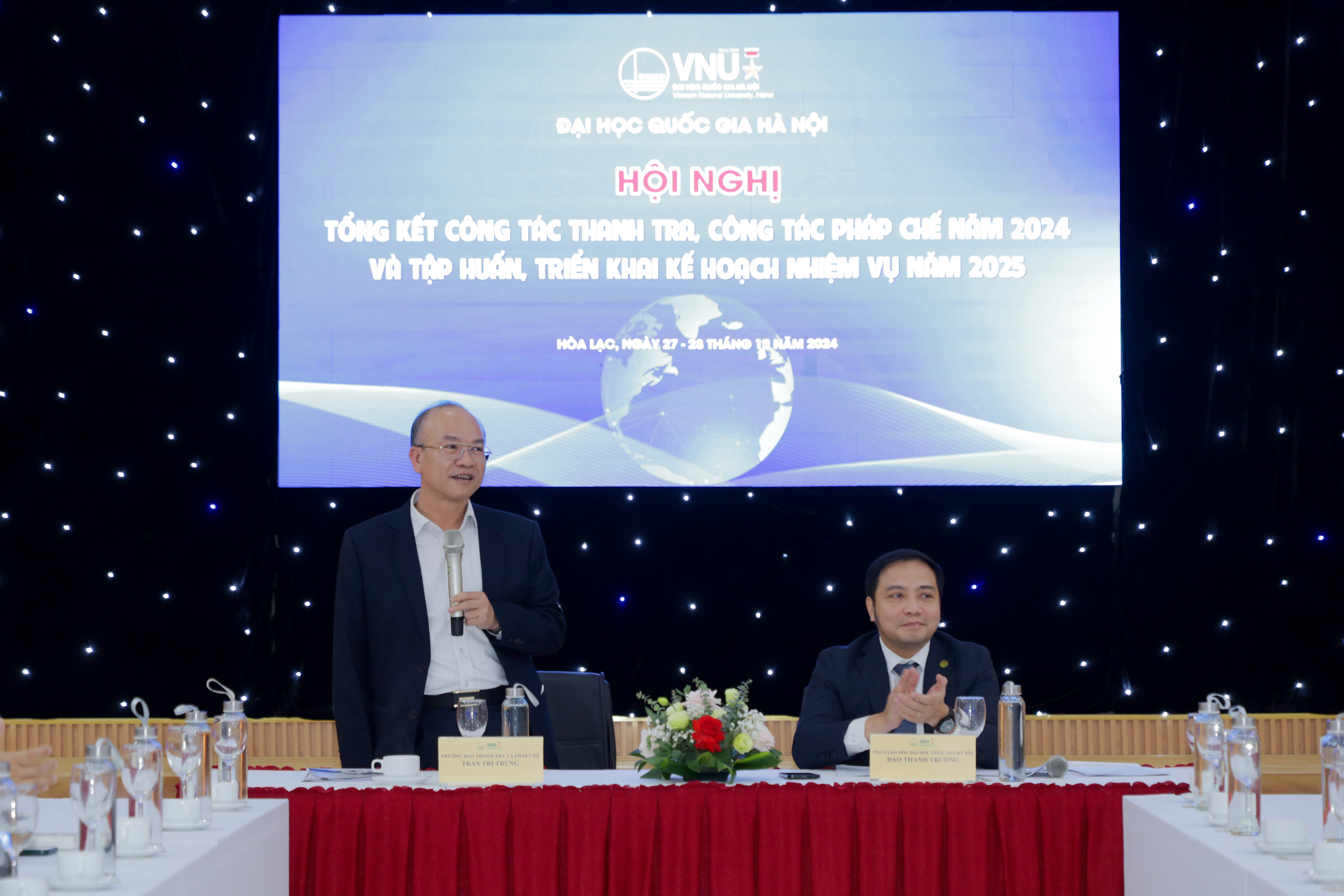 Chủ trì hội nghị có Phó Giám đốc ĐHQGHN Đào Thanh Trường và Trưởng Ban Thanh tra Pháp chế ĐHQGHN Trần Trí Trung.