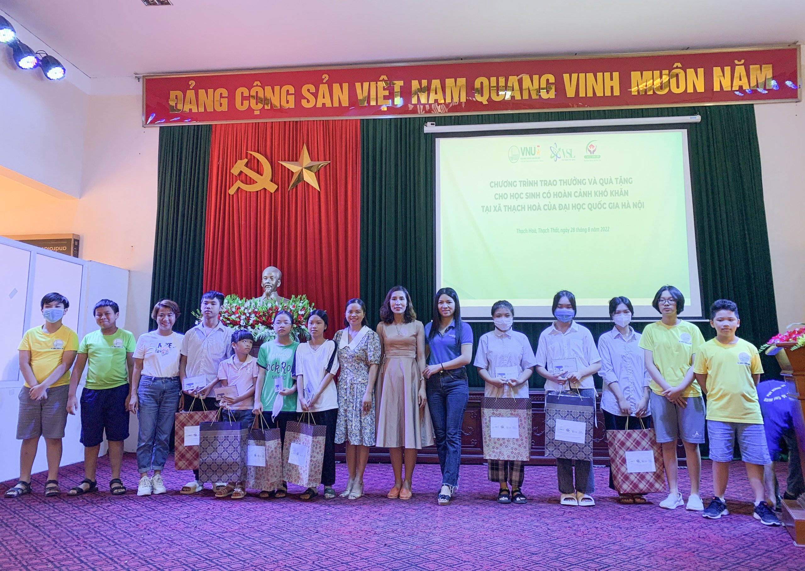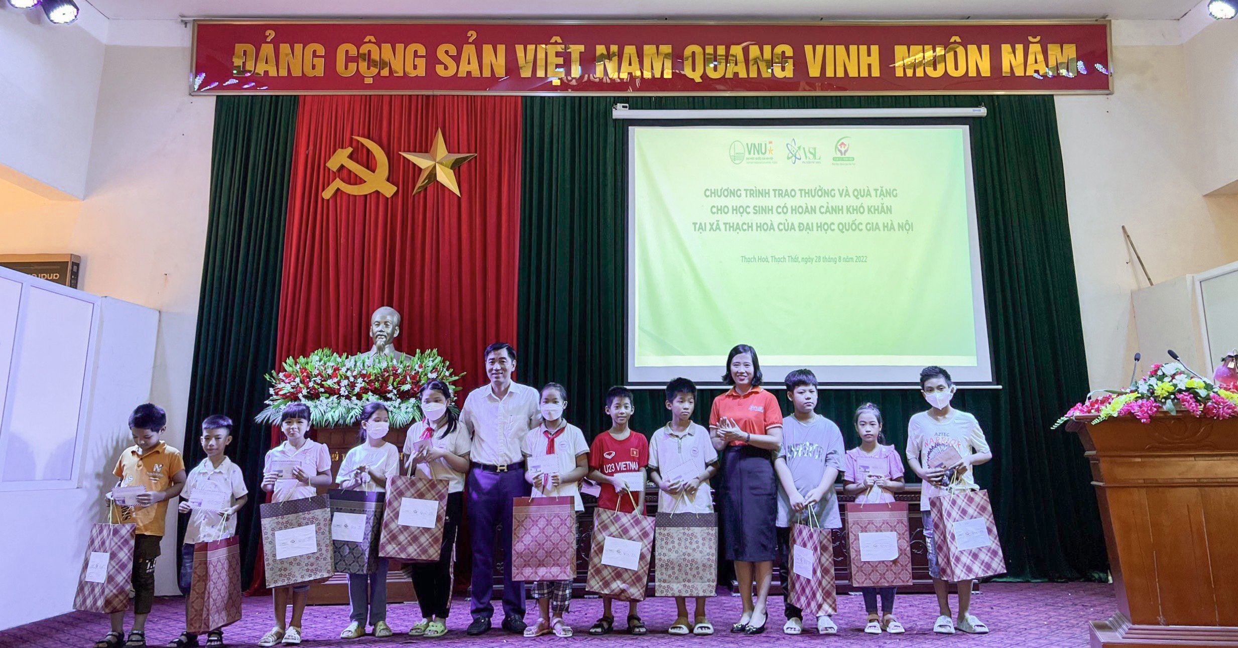 Phó Chủ tịch CLB Nhà khoa học ĐHQGHN Trần Thị Thanh Tú và lãnh đạo xã Thạch Hòa trao quà cho các em