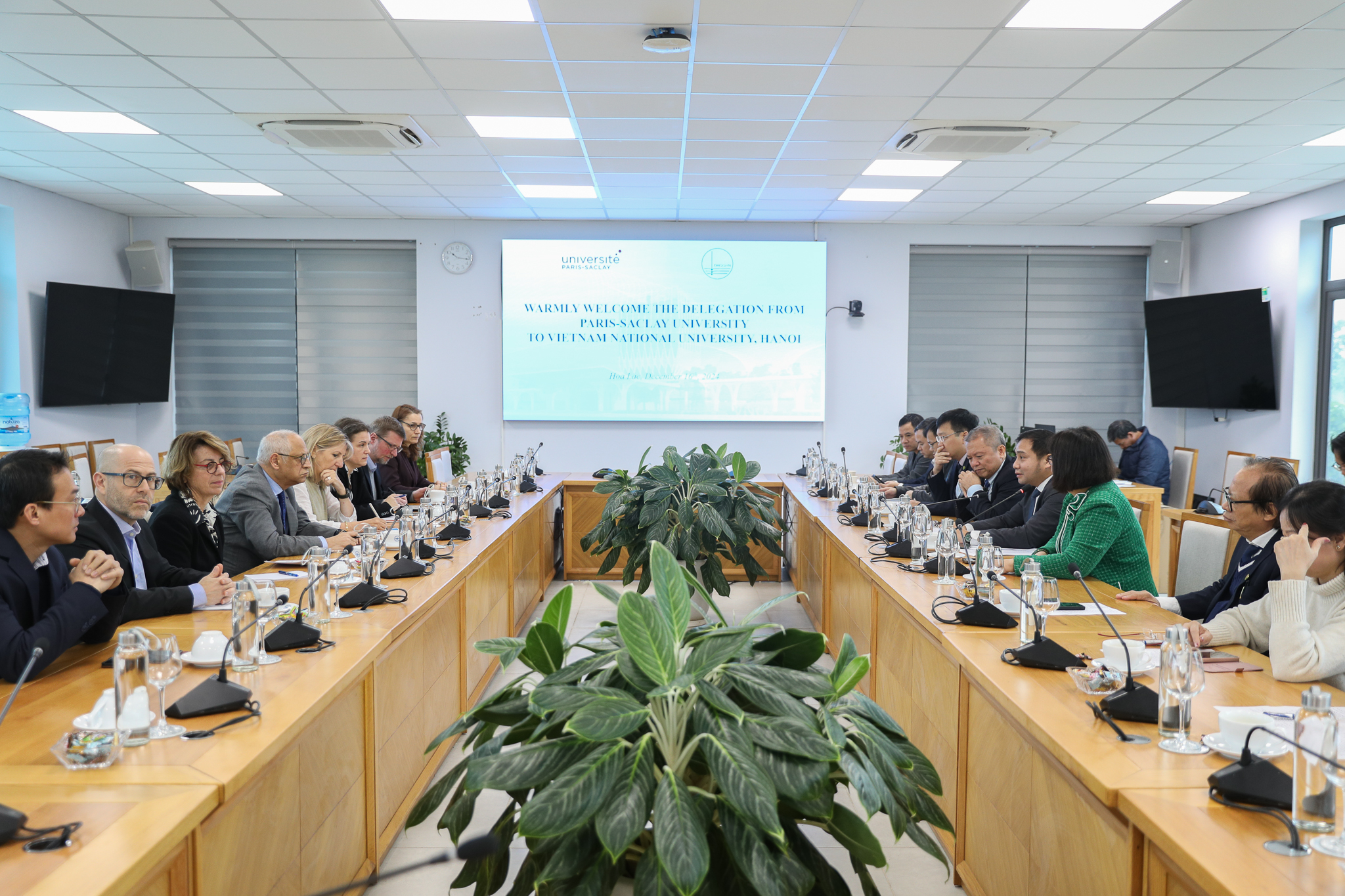 Tại buổi làm việc, Phó Giám đốc Đào Thanh Trường bày tỏ vui mừng khi được đón tiếp đoàn ĐH Paris-Saclay thăm và làm việc với ĐHQGHN tại Hòa Lạc. Ông đã điểm lại một số nội dung chính mà Giám đốc ĐHQGHN GS. Lê Quân và Giám đốc ĐH Paris-Saclay GS. Camille Galap đã thảo luận và ký kết văn bản thỏa thuận hợp tác, trong khuôn khổ chuyến công tác của Giám đốc ĐHQGHN cùng Tổng Bí thư, Chủ tịch nước Tô Lâm tới Cộng hòa Pháp vào tháng 10 vừa qua.