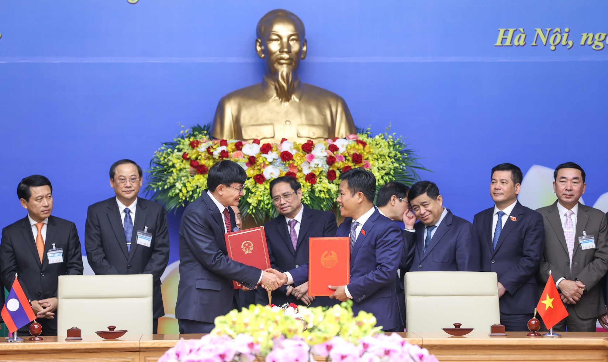 Giám đốc ĐHQGHN Lê Quân (bên phải) và Bộ trưởng Bộ Giáo dục và Thể thao Lào Phout Simmalavong (bên trái) đã trao văn bản thỏa thuận hợp tác năm 2022