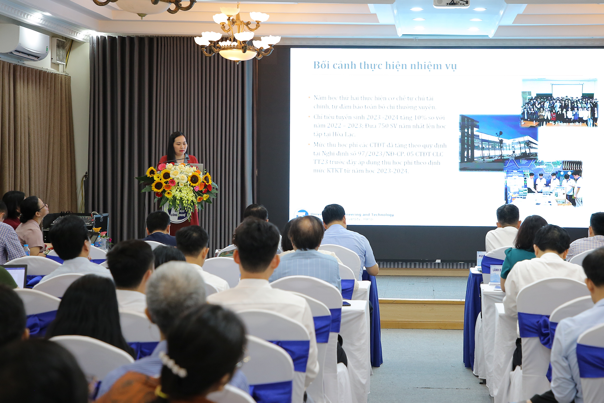 Trong bối cảnh tự chủ và những thách thức, cơ hội mới, năm học 2024-2025, Nhà trường đề ra 7 nhiệm vụ trong tâm là tiếp tục đẩy mạnh đổi mới các hoạt động giảng dạy theo hướng sáng tạo, tuyển sinh, kết nối nhà tuyển dụng. Đó là: Nâng cao chất lượng và số lượng các công bố khoa học quốc tế, các phát minh sáng chế và giải pháp hữu ích, tăng cường các các sản phẩm khoa học công nghệ được ứng dụng và chuyển giao; Tăng cường thu hút, tuyển dụng giảng viên chất lượng cao, xây dựng văn hóa tự chủ và trách nhiệm xã hội; Đẩy mạnh đổi mới công tác quản trị đại học, hoàn thiện cơ chế tự chủ, đẩy mạnh thực hiện chuyển đổi số đại học; Phối hợp với ĐHQGHN đẩy nhanh tiến độ thực hiện dự án xây dựng Trường ĐH Công nghệ tại cơ sở Hòa Lạc; Triển khai thực hiện công tác tái cấu trúc, tái cơ cấu hệ thống tổ chức của Trường; Đẩy mạnh công tác xây dựng, phát triển thương hiệu và tổ chức các hoạt động kỷ niệm 20 năm thành lập, 25 năm truyền thống Trường.