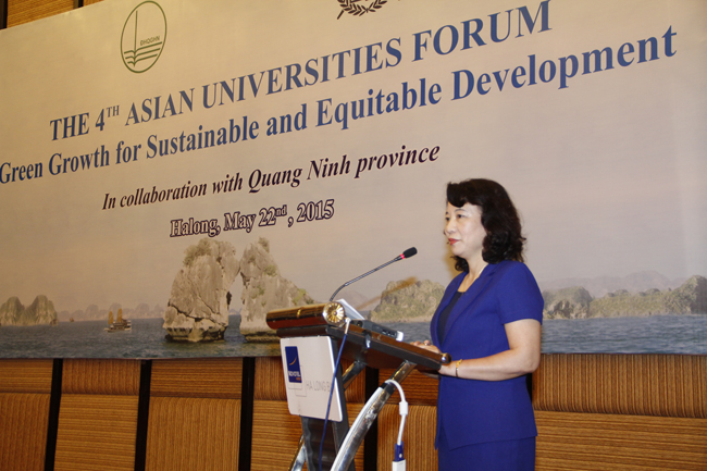 Phát biểu tại Diễn đàn, Phó Chủ tịch UBND Tỉnh Quảng Ninh Vũ Thị Thu Thủy cho biết, với mục tiêu đến năm 2020 trở thành tỉnh dịch vụ, công nghiệp hiện đại, trung tâm du lịch quốc tế và giữ vai trò là một trong những đầu tàu trong phát triển kinh tế của miền Bắc Việt Nam, hiện Quảng Ninh đang triển khai Kế hoạch hành động tăng trưởng xanh nhằm: Giảm cường độ phát thải khí nhà kính, giảm việc khai thác và sử dụng quá mức các nguồn tài nguyên thiên nhiên và năng lượng, từng bước tăng dần tỷ lệ sử dụng năng lượng tái tạo; Xanh hóa sản xuất; Xanh hóa đời sống và tiêu dùng bền vững.