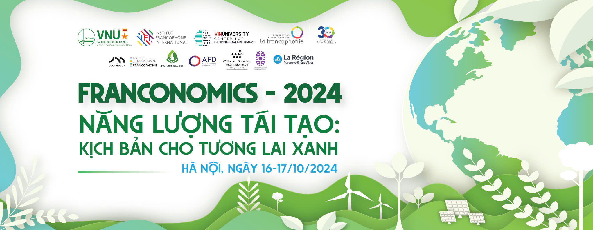 Ngày 16-17/10/2024, tại Hà Nội, Khoa Quốc tế Pháp ngữ - Đại học Quốc gia Hà Nội (VNU-IFI) phối hợp cùng Trung tâm Trí tuệ Môi trường (CEI), trường Đại học VinUni và Tổ chức quốc tế Pháp ngữ (OIF) đồng tổ chức Diễn đàn quốc tế Franconomics - 2024 với chủ đề “Năng lượng tái tạo: kịch bản cho tương lai xanh". Sự kiện có sự đồng hành của Viện Quốc tế Pháp ngữ (2IF) - Đại học Jean Moulin Lyon 3, Quỹ Vì tương lai xanh, Cơ quan Phát triển Pháp tại Việt Nam (AFD), Phái đoàn Wallonie-Bruxelles tại Việt Nam, Viện Nghiên cứu Phát triển Văn hóa, Ngôn ngữ và Giáo dục (CLEF) và Hội đồng Doanh nghiệp Nông nghiệp Việt Nam (VCAC) - Liên đoàn Thương mại và Công nghiệp Việt Nam (VCCI).