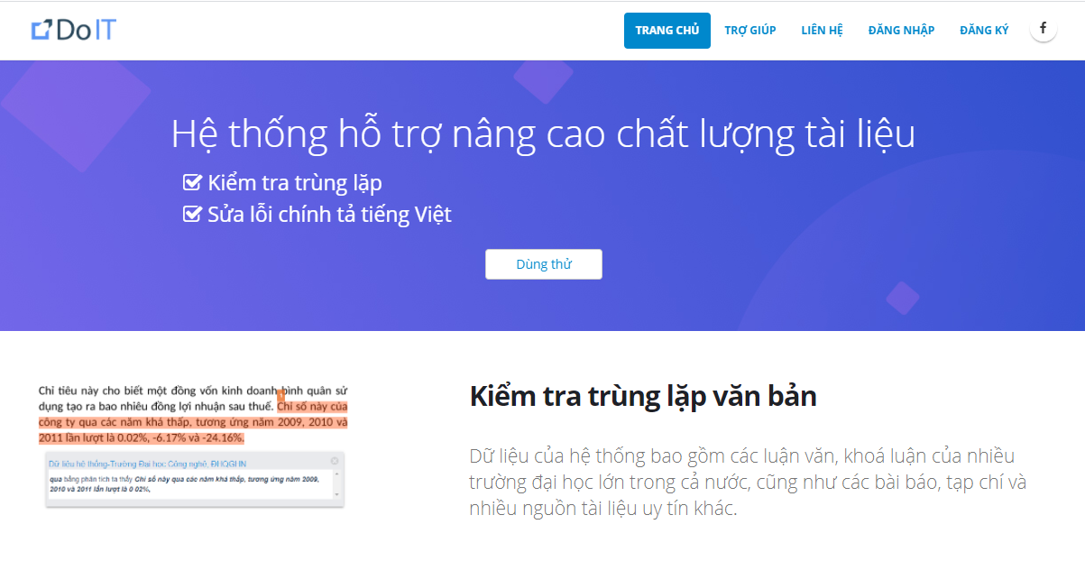 Hệ thống nâng cao chất lượng văn bản - DoIT đã đạt giải Nhì Nhân tài Đất Việt 2017. Bên cạnh đó, quy trình kiểm tra trùng lặp trong nhóm văn bản cũng đã được Cục Sở hữu Trí tuệ (Bộ KH&CN) cấp bằng độc quyền sáng chế số 1-0026606, công bố ngày 25/12/2020. Hiện nay, hệ thống nâng cao chất lượng tài liệu DoIT đã được sử dụng ở khoảng 15 trường như ĐHQGHN, Trường ĐH Luật, Trường ĐH Vinh,... và được người dùng cá nhân từ 60 trường trải nghiệm. Mỗi ngày, vào thời điểm cao điểm như mùa nộp khóa luận, hệ thống DoIT xử lý từ 700 đến hàng nghìn tài liệu với tốc độ xử lý trung bình cho khoảng 50 trang là 1 phút. “Người dùng không có cảm giác phải chờ đợi nhiều và hệ thống có thể đáp ứng tốt với lượng truy cập và sử dụng như hiện tại”, nhóm nghiên cứu cho biết. |