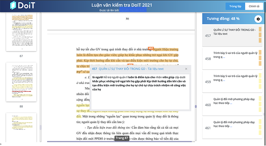 Kết quả kiểm tra trùng lặp của một tài liệu trong hệ thống DoIT