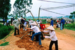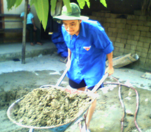 Còn đội SVTN Khoa Khoa học quản lý, Trường ĐHKHXH&NV do Nguyễn Thị Thu Dung làm Đội trưởng thì lại ở tập trung với nhau tại trạm y tế của xã. Ngay ngày đầu ra quân, cả đội đã phối hợp với thanh niên địa phương nạo vét được hơn 2.000 m kênh mương thủy lợi, đã vận động được hàng chục gia đình đồng ý để con em họ tham gia các lớp bồi dưỡng ngoại ngữ, tin học do đội SVTN mở. Khó khăn lớn nhất mà đội gặp phải đó là tình trạng điện bị cắt cả ngày (từ 5 giờ sáng đến 12 giờ đêm) nên không ít hoạt động theo dự kiến phải thay đổi chẳng hạn như các buổi phát thanh trên loa truyền thanh của xã, các đêm giao lưu văn hóa văn nghệ... Bên cạnh đó việc không có điện cũng gây ra rất nhiều khó khăn cho sinh hoạt của toàn đội: Ở tập trung đông người nhưng không thể dùng quạt điện, mất nước nên các thành viên trong đội phải vào nhà dân tắm nhờ, nước uống phải mua mỗi ngày 2 bình khá tốn kém...  |