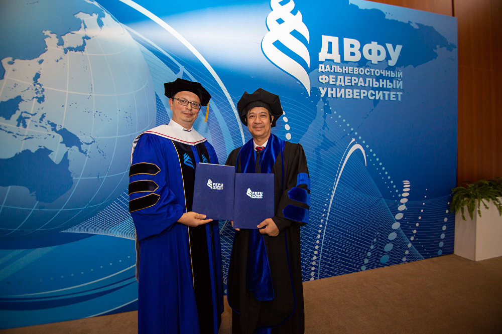 Với nhiều điểm tương đồng về lịch sử hình thành, truyền thống phát triển, đặc biệt tương đồng trong chiến lược phát triển thành đại học đa ngành, đa lĩnh vực hàng đầu mỗi quốc gia, ĐHQGHN và Đại học Tổng hợp Liên bang Viễn Đông (FEFU) đã triển khai hợp tác từ năm 2012, tập trung lĩnh vực đào tạo về ngôn ngữ và văn hóa Nga, ngôn ngữ và văn hóa Việt Nam. Bày tỏ vinh dự khi được nhận danh hiệu cao quý từ một trường đại học uy tín lớn của Nga, Giám đốc Nguyễn Kim Sơn tin rằng sự kiện này là một mốc quan trọng, đánh dấu sự phát triển mới nhằm tăng cường quan hệ hợp tác giữa hai bên.