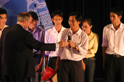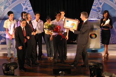 Buổi giao lưu kết thúc trong không khí vui mừng và thân thiện khi đại diện lãnh đạo của MicroSoft trao thưởng cho sinh viên Trường ĐH Công nghệ Đinh Ngọc Thắng đã đoạt giải Nhất tại vòng khởi động cuộc thi “Sẵn sàng với tri thức mới”.