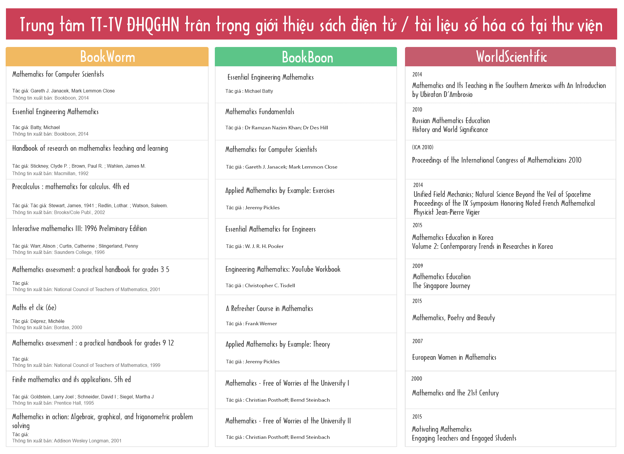 Trung tâm TT-TV trân trọng giới thiệu sách điện tử / tài liệu số hóa có tại thư viện theo Chủ đề Mathematics trong Bookworm, Bookboon, World Scientific.