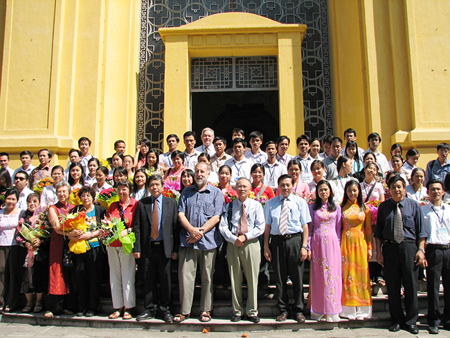 GS. Nguyễn Quang Riệu (giữa) và các nhà khoa học quốc tế với các học viên của lớp Vật lý thiên văn được tổ chức ở ĐHQGHN
