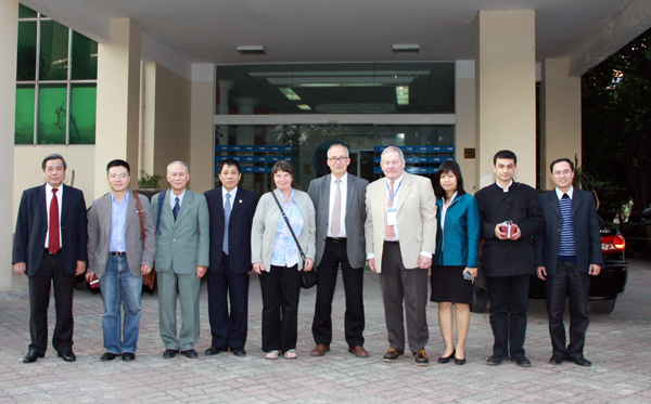 GS. Nguyễn Quang Riệu (thứ 3 từ trái sang), GS. Pierre Encrenaz (thứ 4 từ phải sang), GS. Ngô Bảo Châu (thứ 2 từ trái sang) với lãnh đạo ĐHQGHN năm 2010