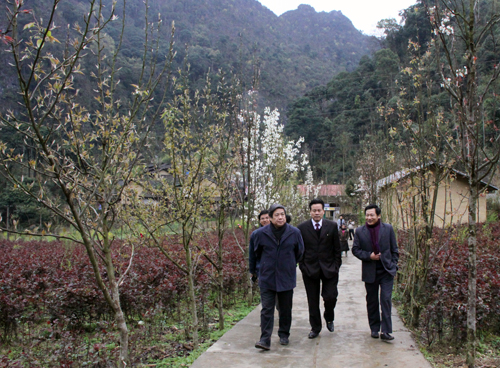 Đoàn công tác của ĐHQGHN do GS.TS Mai Trọng Nhuận - Giám đốc, GS.TSKH Vũ Minh Giang - Phó Giám đốc dẫn đầu cùng lãnh đạo tỉnh Hà Giang thị sát tại Dinh họ Vương |