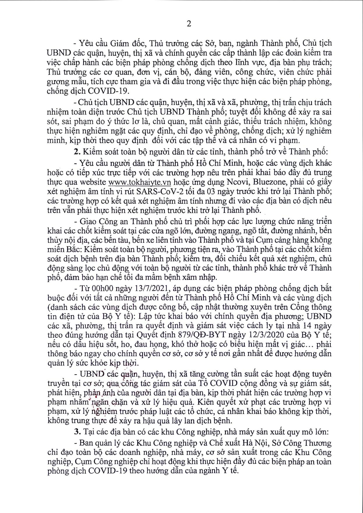 Từ 0h ngày 13/7, Hà Nội áp dụng các biện pháp phòng chống dịch bắt buộc đối với tất cả những người đến từ TP.HCM và các vùng dịch (danh sách các vùng dịch được công bố, cập nhật thường xuyên trên Cổng thông tin điện tử của Bộ Y tế).