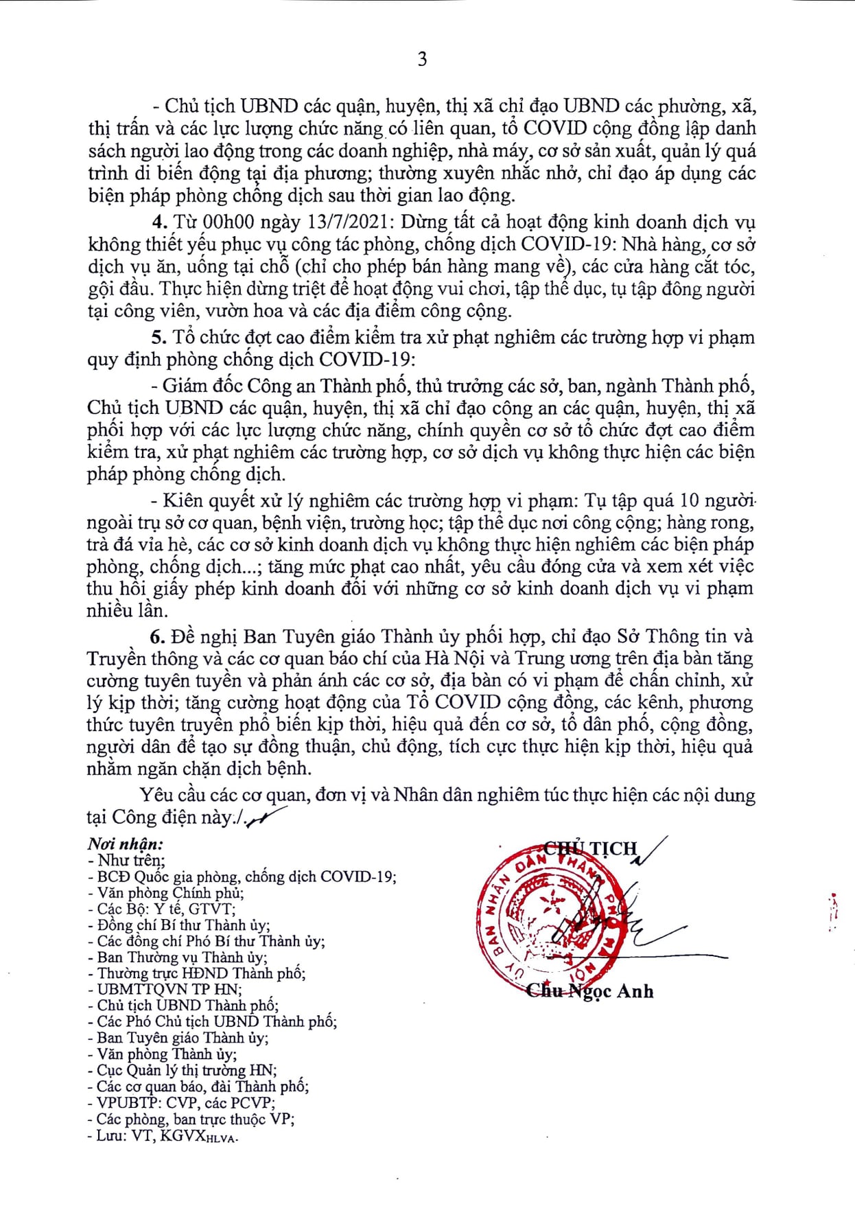 Hà Nội kiên quyết xử lý nghiêm các trường hợp vi phạm như tụ tập quá 10 người ngoài trụ sở cơ quan, bệnh viện, trường học; tập thể dục nơi công cộng; hàng rong, trà đá vỉa hè, các cơ sở kinh doanh dịch vụ không thực hiện nghiêm các biện pháp phòng, chống dịch...; tăng mức phạt cao nhất, yêu cầu đóng cửa và xem xét việc thu hồi giấy phép kinh doanh đối với những cơ sở kinh doanh dịch vụ vi phạm nhiều lần.