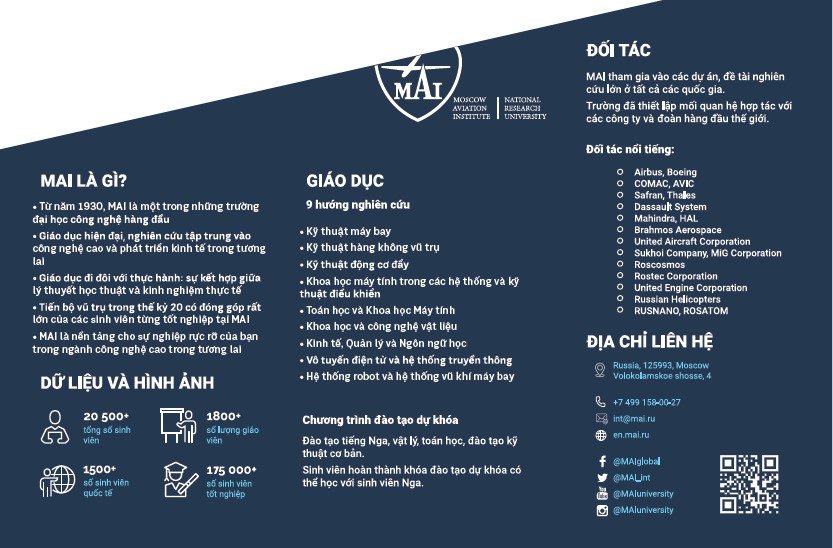 MAI là trường đại học tổng hợp hàng không vũ trụ hàng đầu tại Nga, được thành lập vào năm 1930. Trường Đại học Hàng không trải qua lịch sử phát triển lâu dài , trước đây tập trung chủ yếu vào kỹ thuật máy bay và trực thăng, nay đã trở thành một trường tổng hợp bách khoa hàng không vũ trụ, đảm bảo đào tạo nguồn nhân lực phạm vi rộng cho nhiều tổ chức khoa học và thiết kế dự án trong lĩnh vực hàng không và tên lửa và vũ trụ. Giờ đây, các sinh viên có thể tiếp cận hơn 60 lĩnh vực đào tạo cho các chương trình cử nhân và thạc sỹ: hàng không và chế tạo tên lửa, điện tử trên tàu và điều khiển học kỹ thuật, vô tuyến điện tử và hệ thống liên lạc, hệ thống rô bốt kỹ thuật, vật liệu và công nghệ hiện đại (xem Phụ lục "Danh mục các lĩnh vực đào tạo").