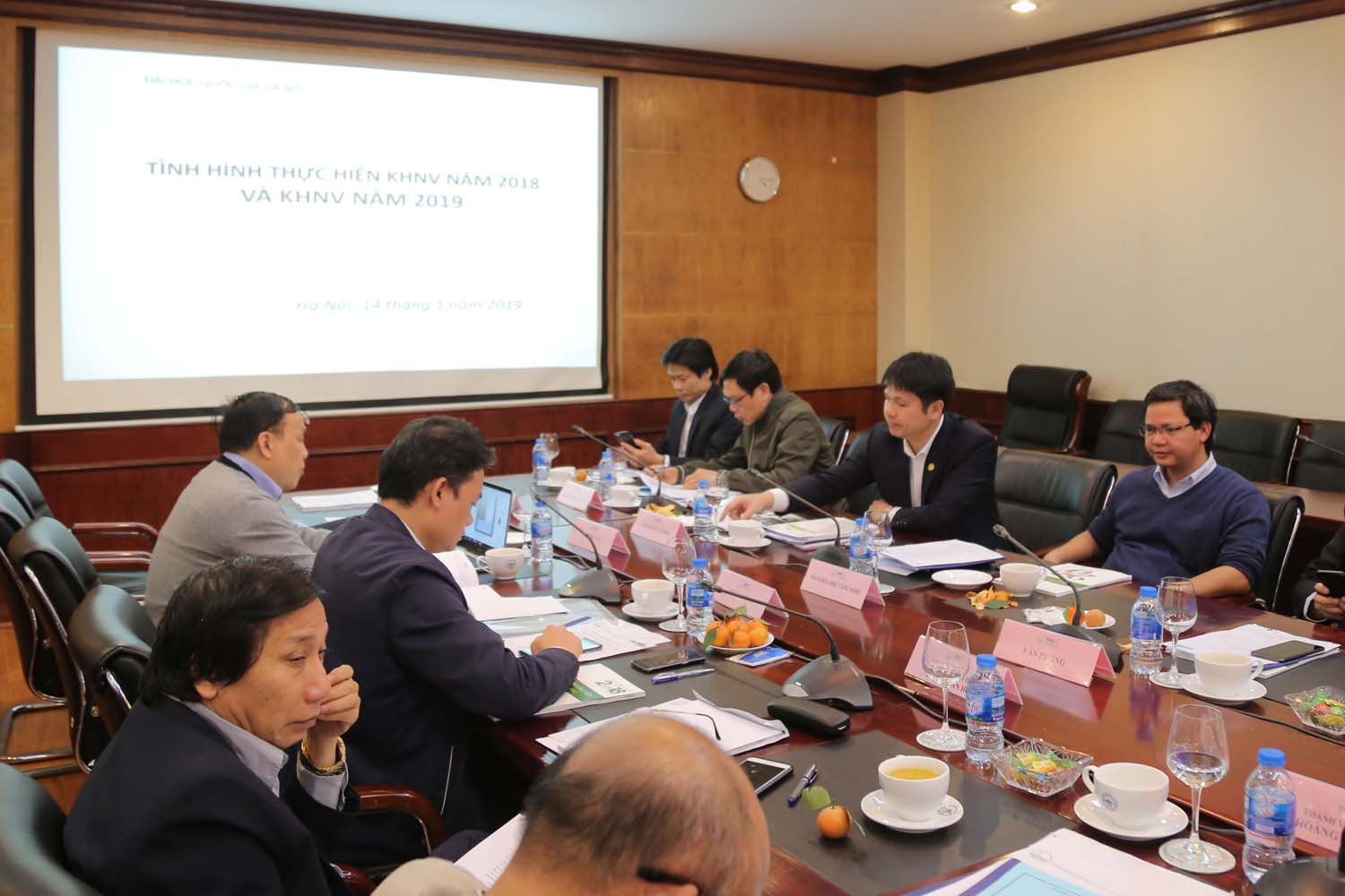 Tại phiên họp, Phó Giám đốc Nguyễn Hoàng Hải thay mặt Ban Giám đốc ĐHQGHN báo cáo tình hình thực hiện kế hoạch nhiệm vụ năm 2018 và chỉ tiêu kế hoạch nhiệm vụ năm 2019 của ĐHQGHN. Theo đó, trong năm 2018, về mảng đào tạo, ĐHQGHN tuyển sinh vượt khoảng 5% so với mức chỉ tiêu đặt ra là 8500 sinh viên trong bối cảnh đề thi năm 2018 khó so với mọi năm và sự xuất hiện của ngày một nhiều các chương trình chất lượng cao, chuẩn quốc tế. Phó Giám đốc đánh giá, đây là một tín hiệu đáng mừng, thể hiện chất lượng tuyển sinh đầu vào của ĐHQGHN không chỉ gia tăng về số lượng mà còn đảm bảo về chất lượng ngày càng cao. Mặt khác, cũng trong năm 2018, ĐHQGHN đã mở thêm nhiều chương trình đào tạo mới, và các chương trình này đều thuộc diện chất lượng cao – thu học phí đủ để bù đắp cho công tác đào tạo.