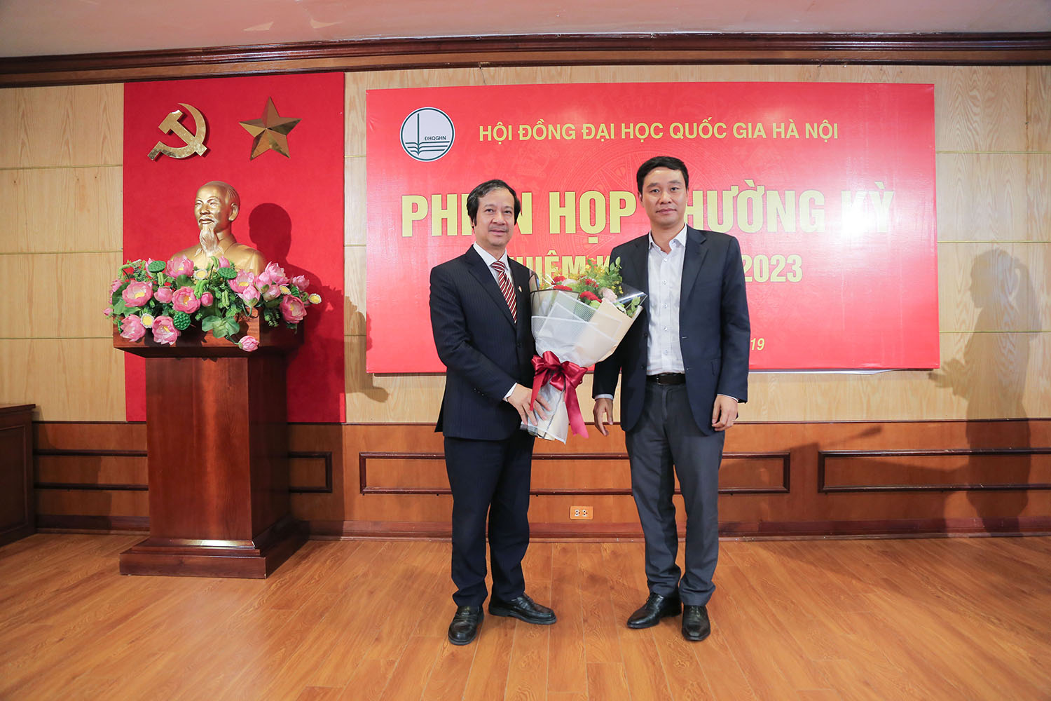 Phó Bí Thư, Phó Giám đốc ĐHQGHN Nguyễn Hoàng Hải tặng hoa chúc mừng Tân Chủ tịch Hội đồng ĐHQGHN Nguyễn Kim Sơn