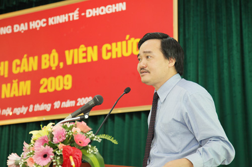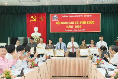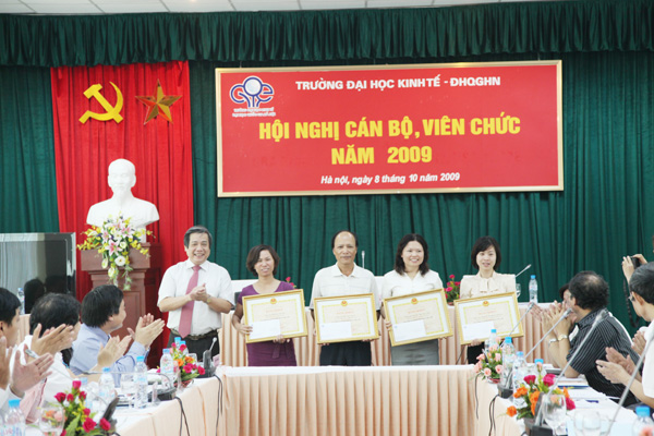 GS.TSKH Vũ Minh Giang đã trao Giấy khen của Đảng uỷ ĐHQGHN cho Chi bộ Khối Hiệu bộ và 8 cá nhân thuộc Trường ĐHKT; trao Bằng khen của Giám đốc ĐHQGHN cho 5 cá nhân và Giấy chứng nhận danh hiệu Chiến sĩ Thi đua cấp ĐHQGHN cho 10 cá nhân đạt nhiều thành tích trong năm học 2008 - 2009. |